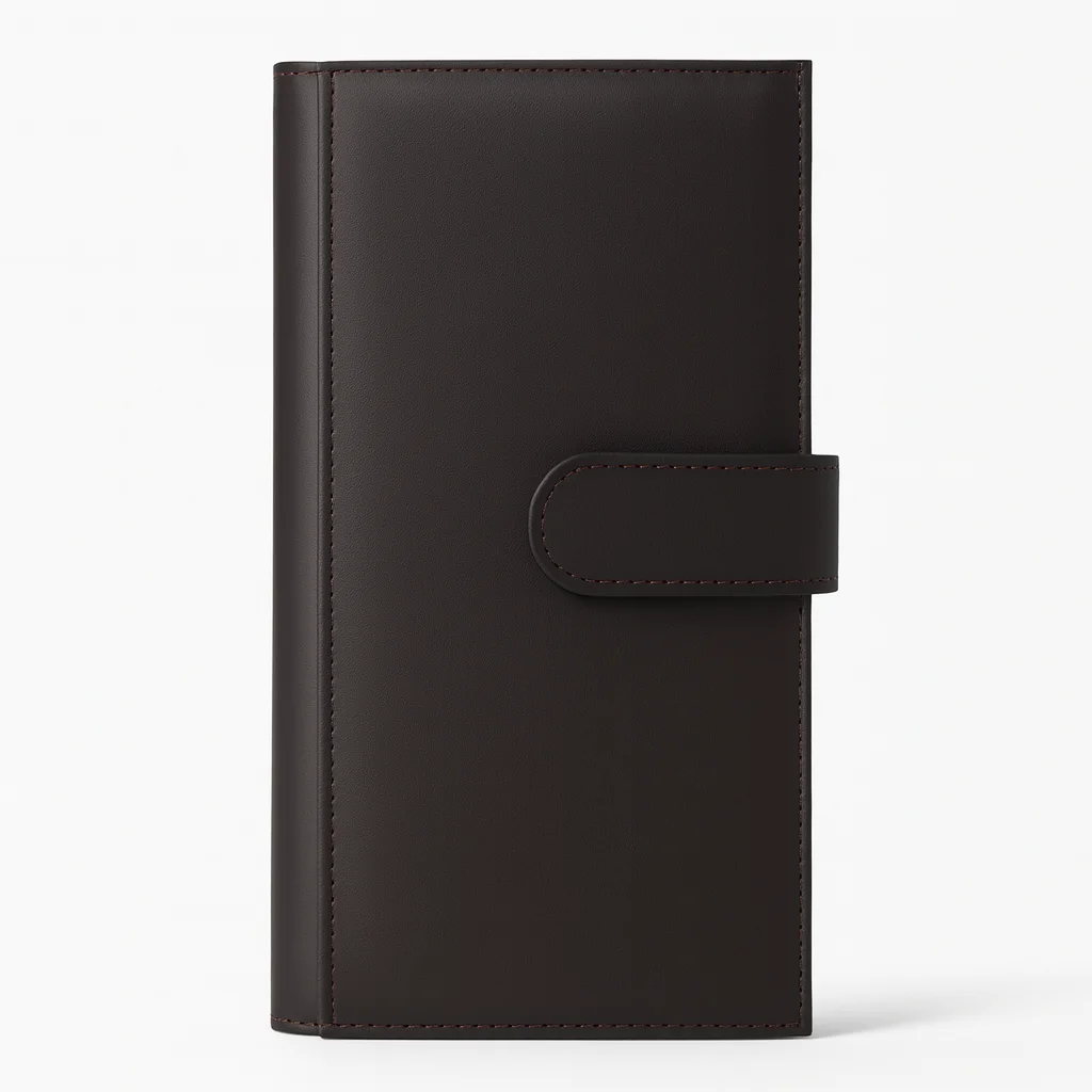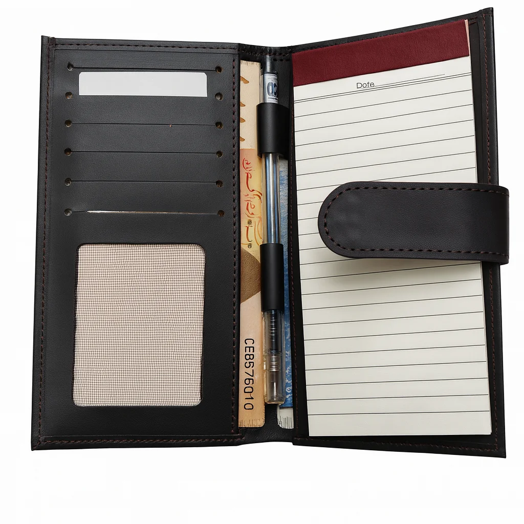 Premium dark brown leather long wallet with 6 card slots, 2 cash compartments, and built-in notepad with pen. Stylish, functional, and perfect for business use.