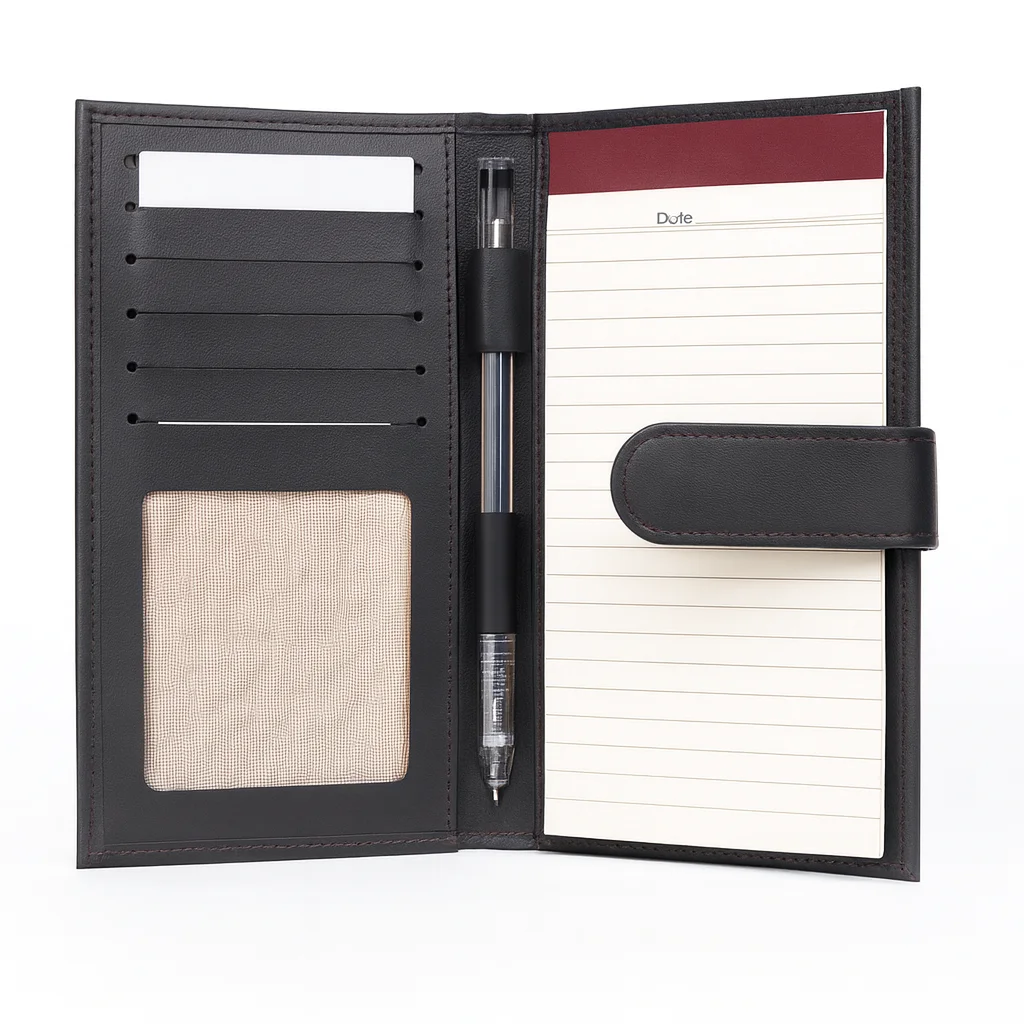 The wallet features six dedicated card slots to securely store your essential credit, debit, and ID cards. Two spacious cash compartments provide ample room for organizing currency, receipts, or documents. A built-in notepad holder with pen adds extra convenience, making it ideal for meetings, travel, and everyday professional use.