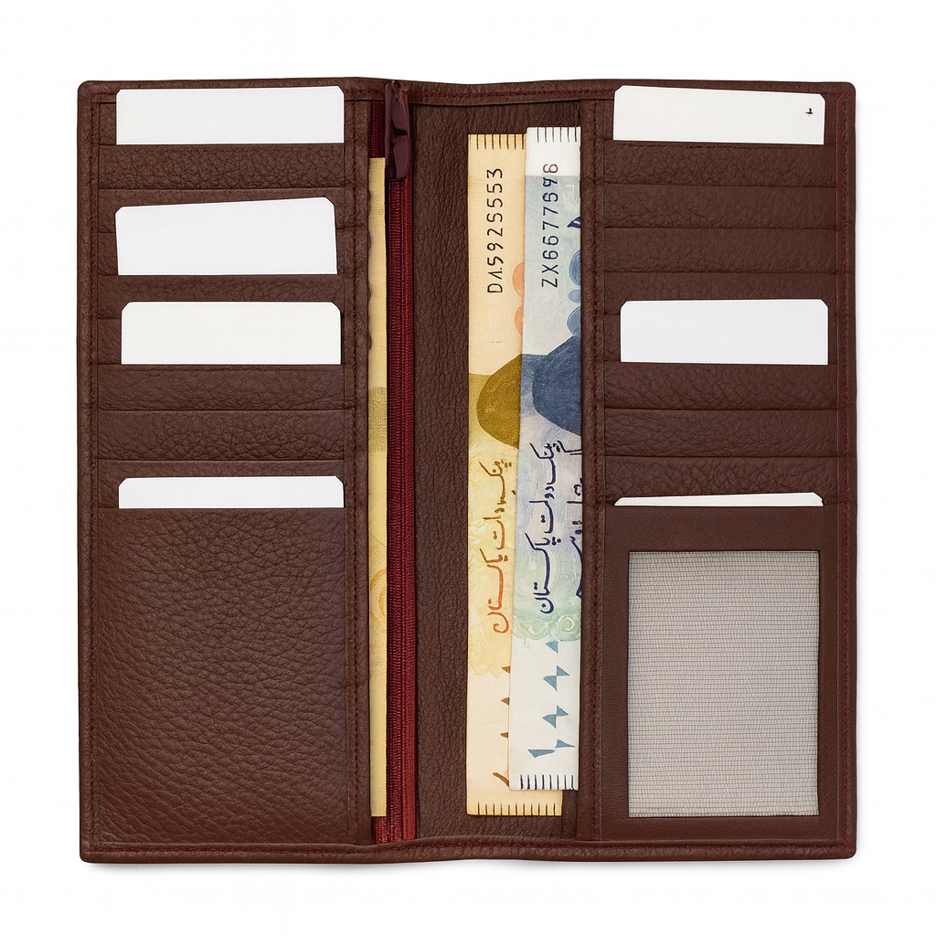 Built to handle more without looking bulky, the wallet offers 18 card slots to securely store credit cards, debit cards, IDs, and business cards. A dedicated mobile slot provides convenient space for a smartphone and can also be used as an extra money compartment. For added safety, the zippered money slot keeps important cash secure, while two spacious cash slots allow easy access to notes.